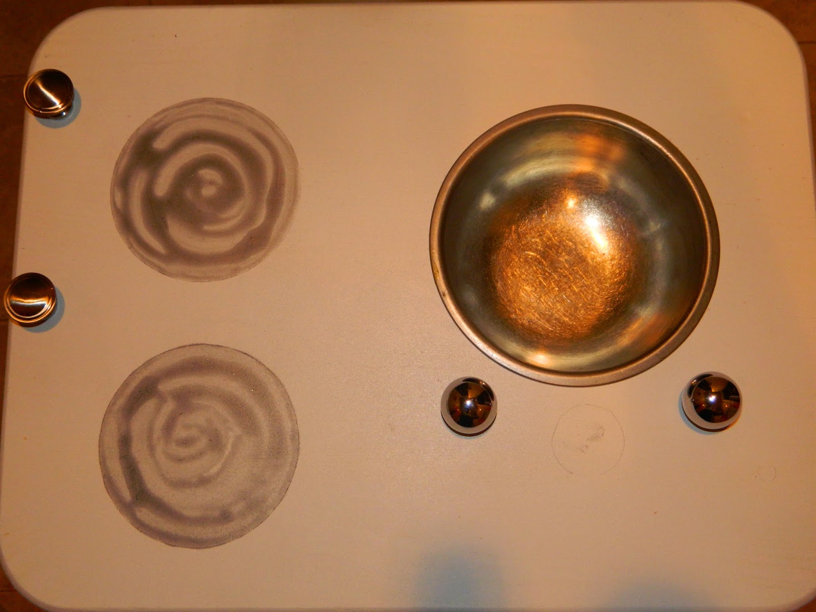 Here is a close up of the top before the faucet it on. I traced a small bowl to get the burner sizes, and then used some grey paint to give it a swirl design. The knobs are on. I left them a little unscrewed so that they can remain moveable- to turn "off" and "on."